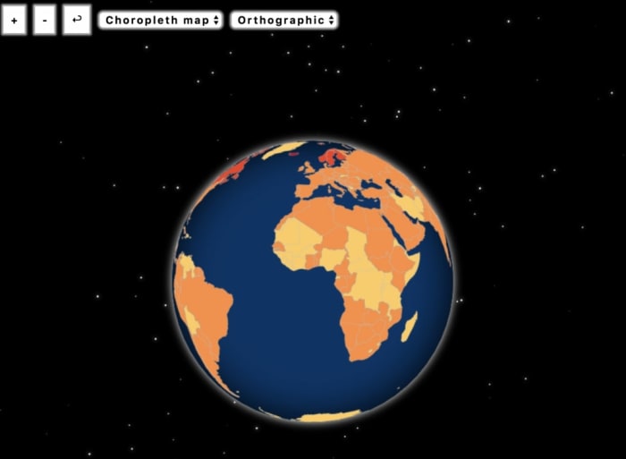 Another interesting projection is an orthographic projection. The aim is to visualize 3D objects in two dimensions (e.g. on a web browser). D3 provides us with an geoOrthographic projection which enables us to visualize the Earth as a globe (or in this case as a planar circle). The downside of this projection is that we won’t be able to fit all of the continents on our canvas as we would in a Mercator projection. However, we can change the projection rotation when the user interacts with our map, enabling them to focus on their points of interest.