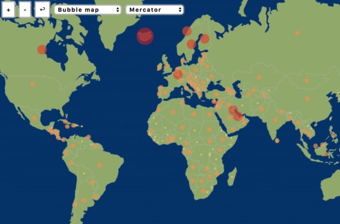 Firstly, lets see how the bubble map serves our purpose. In order to create it we have to create a scale for the bubbles. We can use a linear scale from D3-scale or a categorical scale in order to define categories with the values we want to represent. After choosing a scale, we place our bubble in the geometric center of the specific country. Now we are good to go with data visualization.